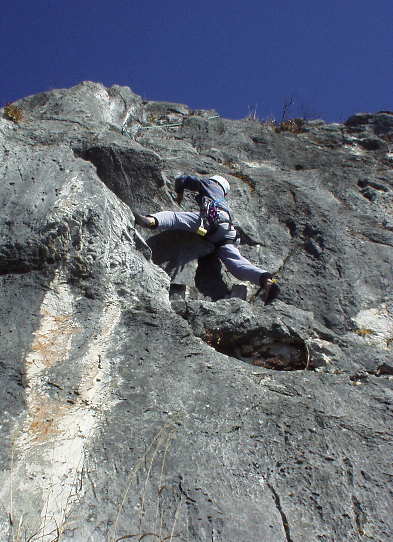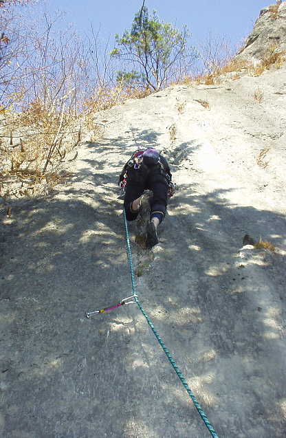 ↑ 続く5ピッチ目(V-)をリードするNob。 覆い被さる岩にヘルメットがぶつかり、思わずお爺さん登りに。(^^;