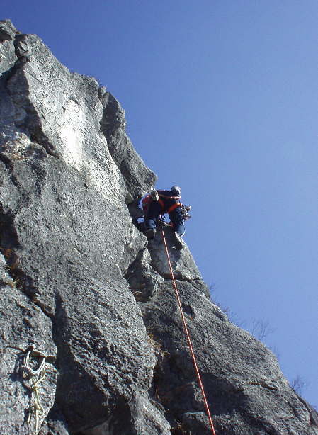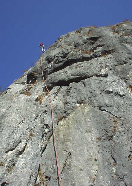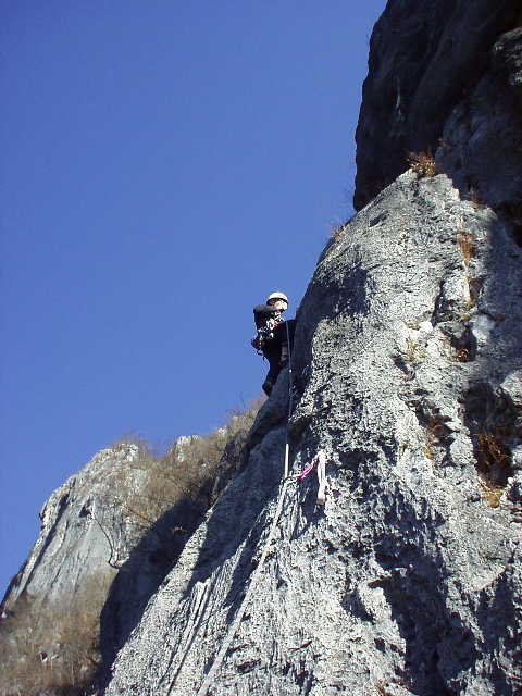 ↑ 2ピッチ目(5.8)はテラスから左のカンテ状のフェースにルートをとりました。リードするのは竜少年さん。