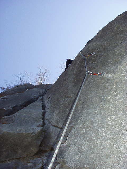 ↑ 大テラスからは傾斜もゆるくなり3〜4ピッチで頂上に達することができます。 これは4ピッチ目(IV)のフレークをフォローするMiyaさん。