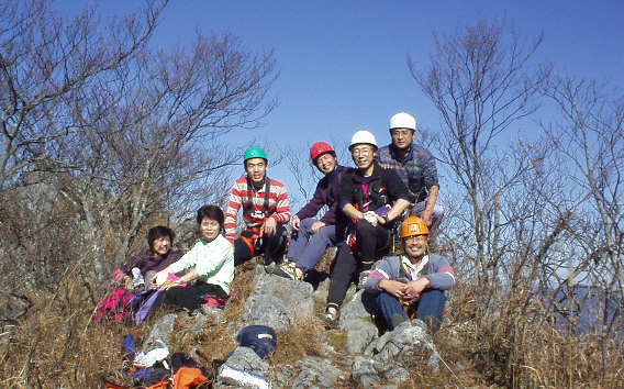 ↑ 3ピッチ目は通常は画面左手のクラックを登りますが、平均年齢57歳の中高年隊は果敢に右手フェースにあるラップタイム(5.9)にトライ。リードするのは中高年隊エースの竜少年さん。