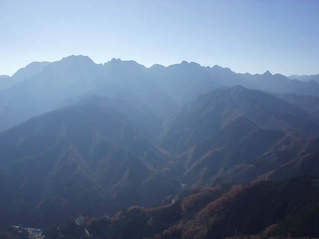 ↑ 快晴の頂上からは、日本百名山の一つである両神山が逆光の中に輝いていました。