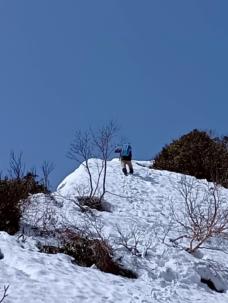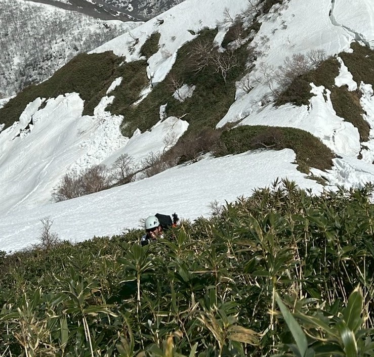 仙ノ倉谷を越えたあたり、北尾根の末端から登攀準備して取り付く。急登ではあるものの、雪がしまっているのでアイゼンがよく効く。しばらくは雪の斜面をひたすら登高するが、途中から薮とのミックスとなる。藪漕ぎは体力消耗し、なかなか手強い。この薮の攻略がこの時期の北尾根の核心だ。
