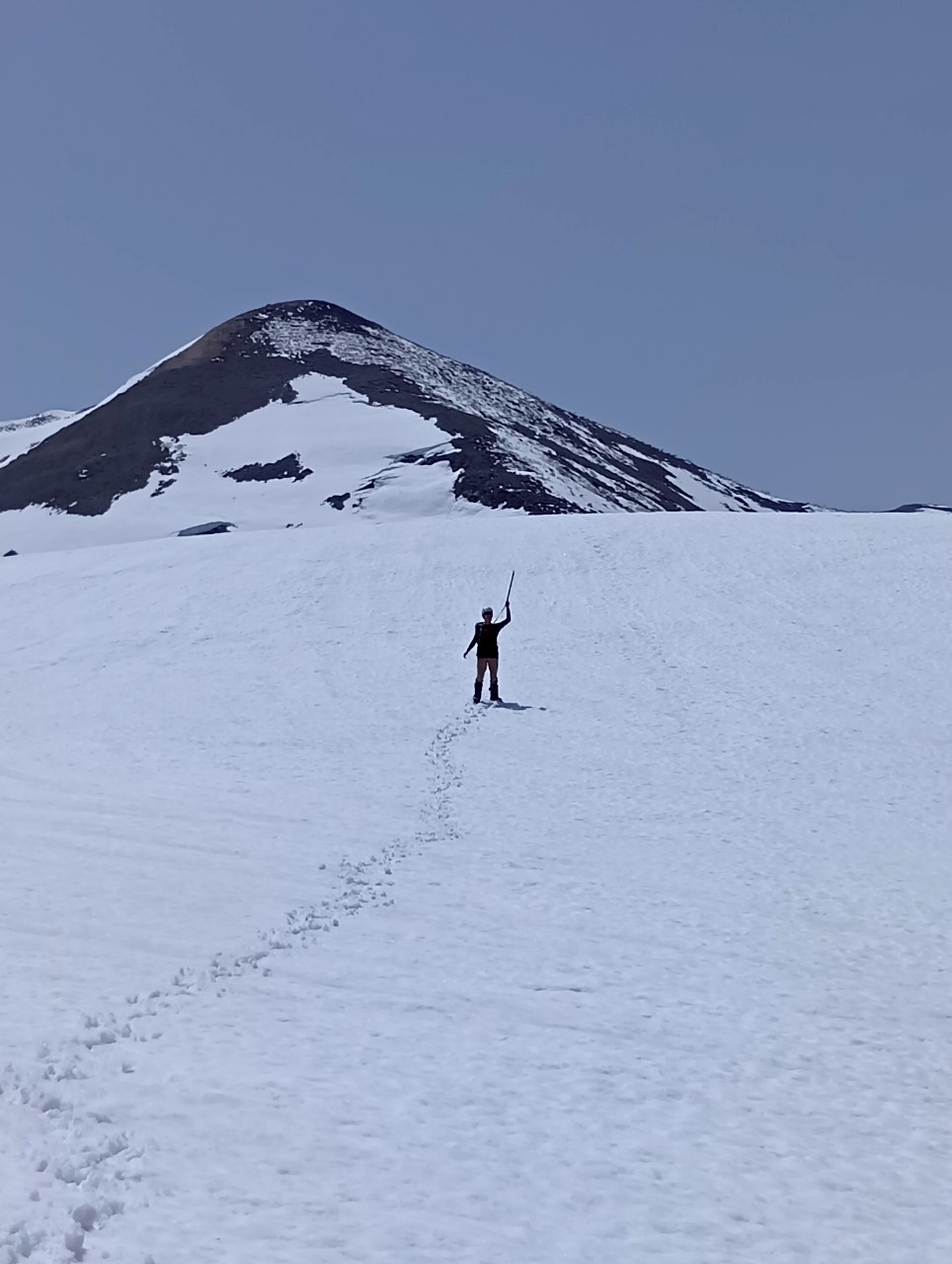 日が高くなると、雪がズブズブになってきて、何度かハマり足を取られる。その間、遠くのルンゼや、通過してきた尾根近くの急斜面で雪崩が発生しているのを度々見かけており、早く山頂へ着かないかと思いながら登坂していた。