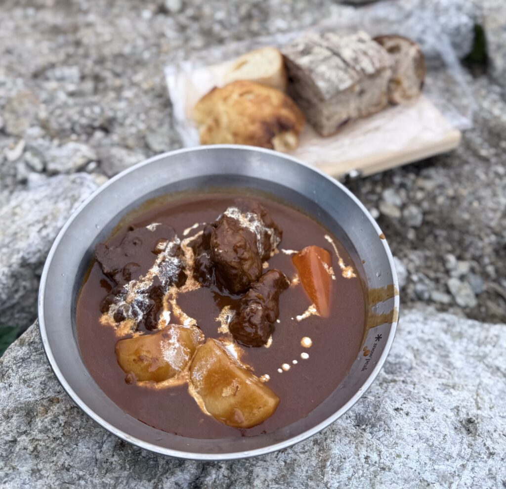 初日キャンプ場での晩御飯は、ガジさん手作りビーフシチュー。