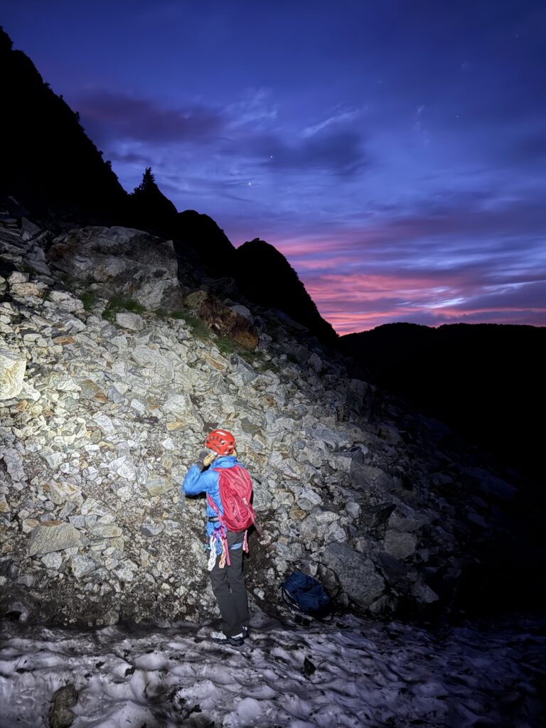 朝3時過ぎにテン場を出発。気温10℃もない寒いなか沢をくだり、途中から雪渓にのりチェンスパをはいて、程なく取り付きに到着。登攀ルートには先をゆくパーティのヘッデンが見えます。