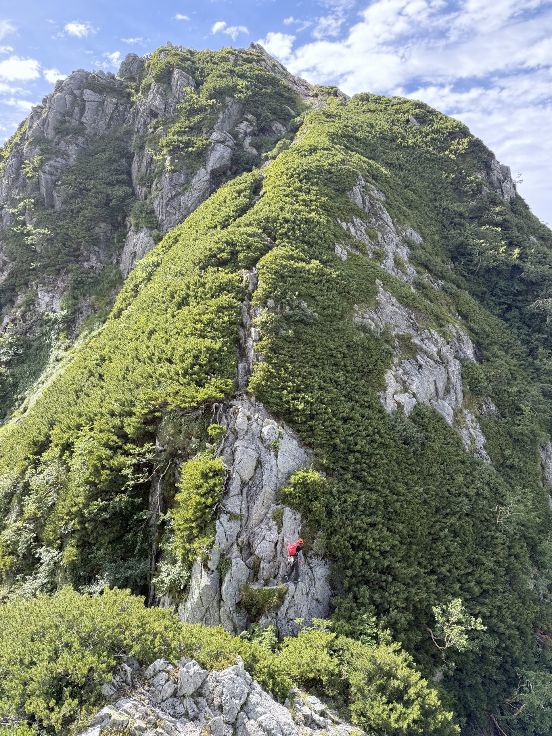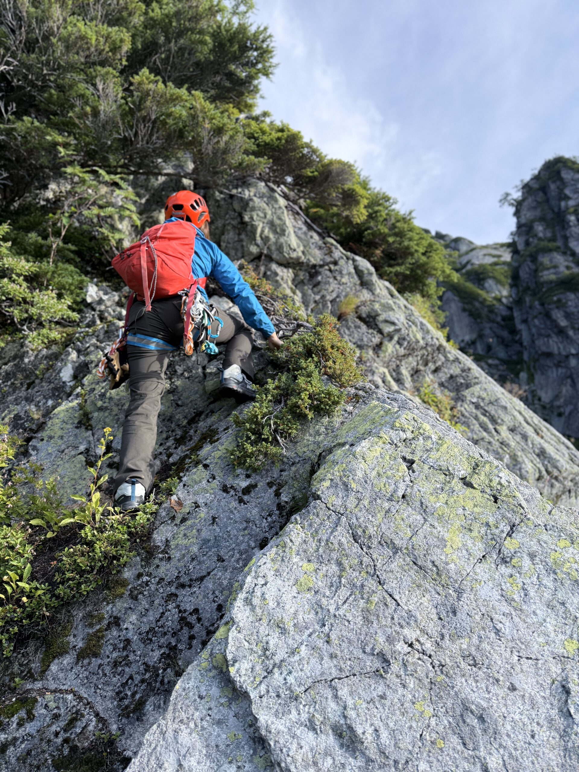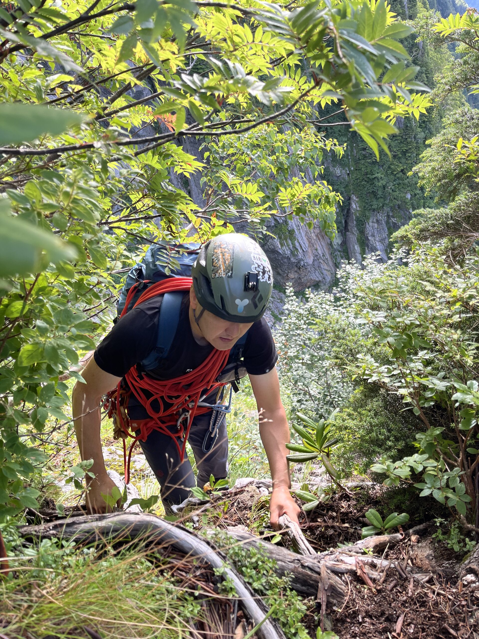 急なガレ場をすすみ、木の根を掴んでズンズン高度をあげ岩場が出現すると先行パーティはロープを出しておりそこで渋滞。我々もロープを出したり(結果としては必要ないレベルの岩場)絡まったロープをほどいたりを繰り返す。各所、待ち時間はたっぷりあったので、都度、2人で色々相談したり試したり出来たのは良い経験でした。