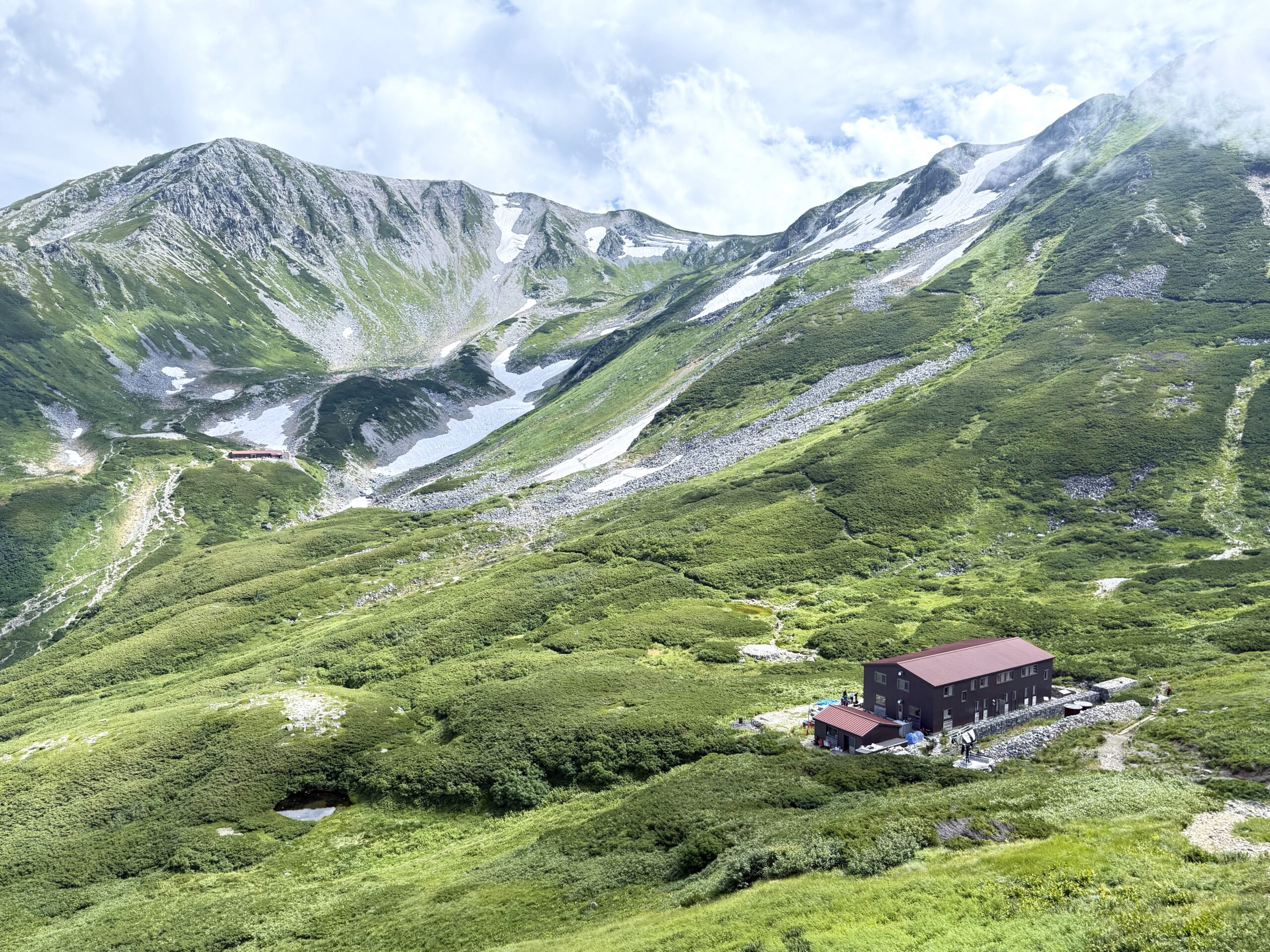 目的地は写真左の剣沢キャンプ場(テント場)ですが、実はこの夜から翌日の昼にかけ暴風雨となる予報。