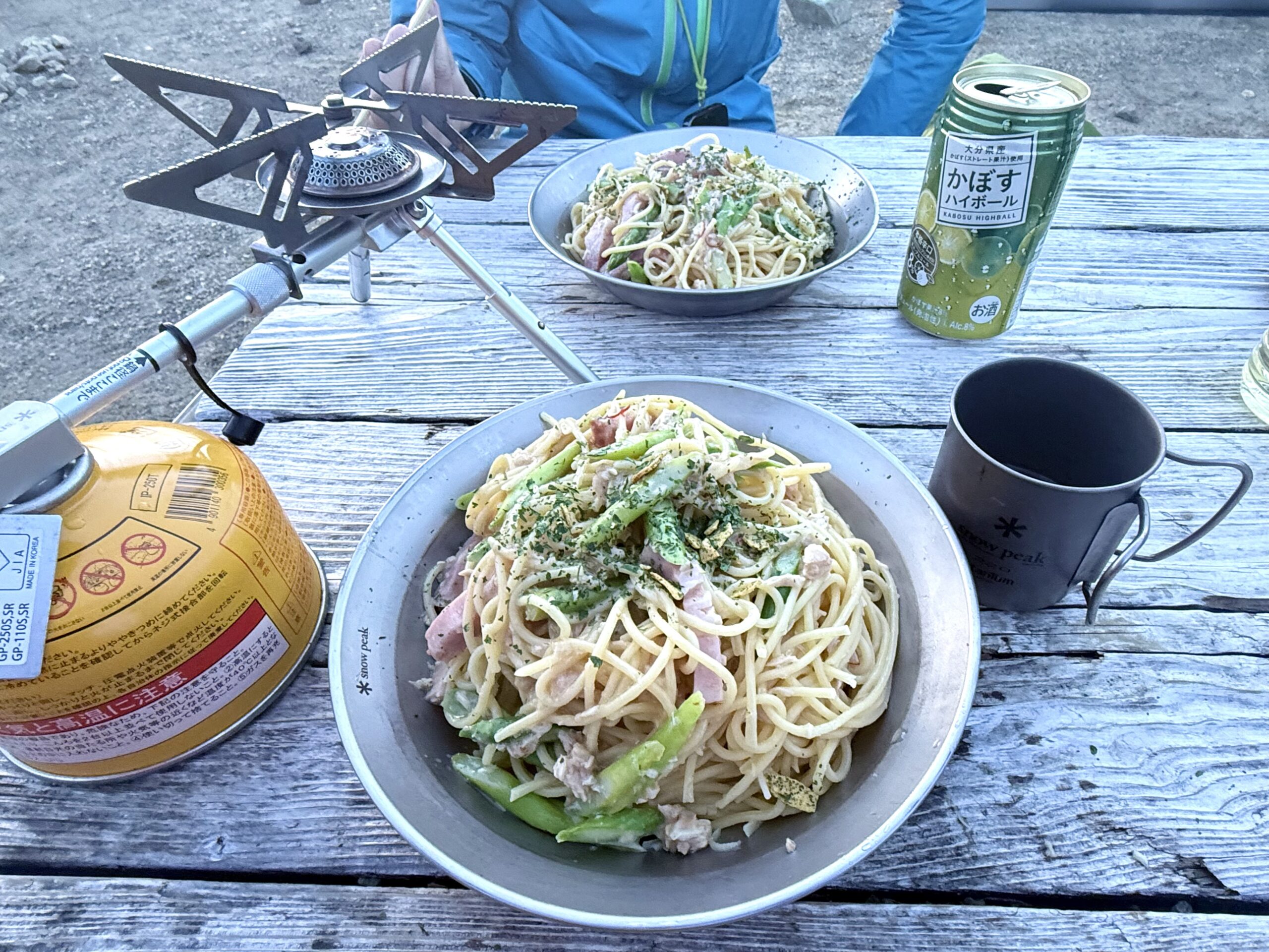 ハッシーさんがベーコン、アスパラ、シーチキン入りペペロンチーノを調理してくれました(感謝!!)