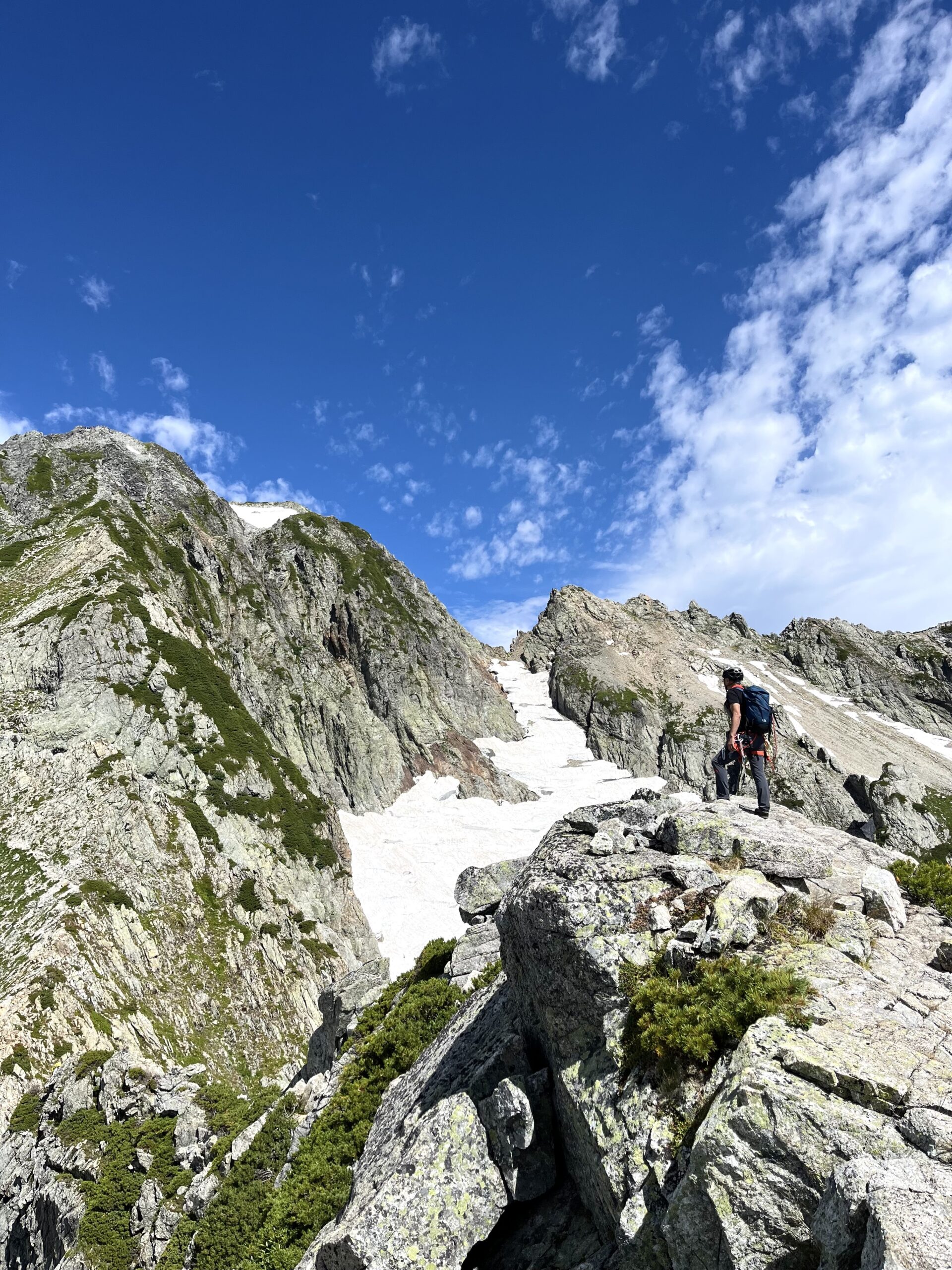 到着時点で風も収まり天気も(予報通り)良さそうだったので登攀します(この日の雪渓の状態は締まっていてチェーンスパイクで問題なしでした)。