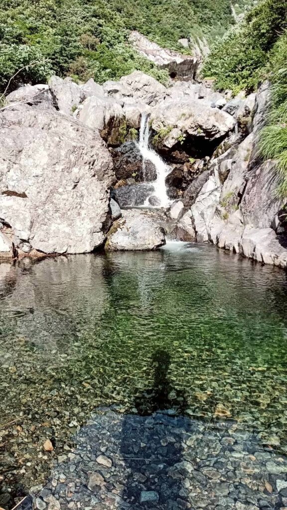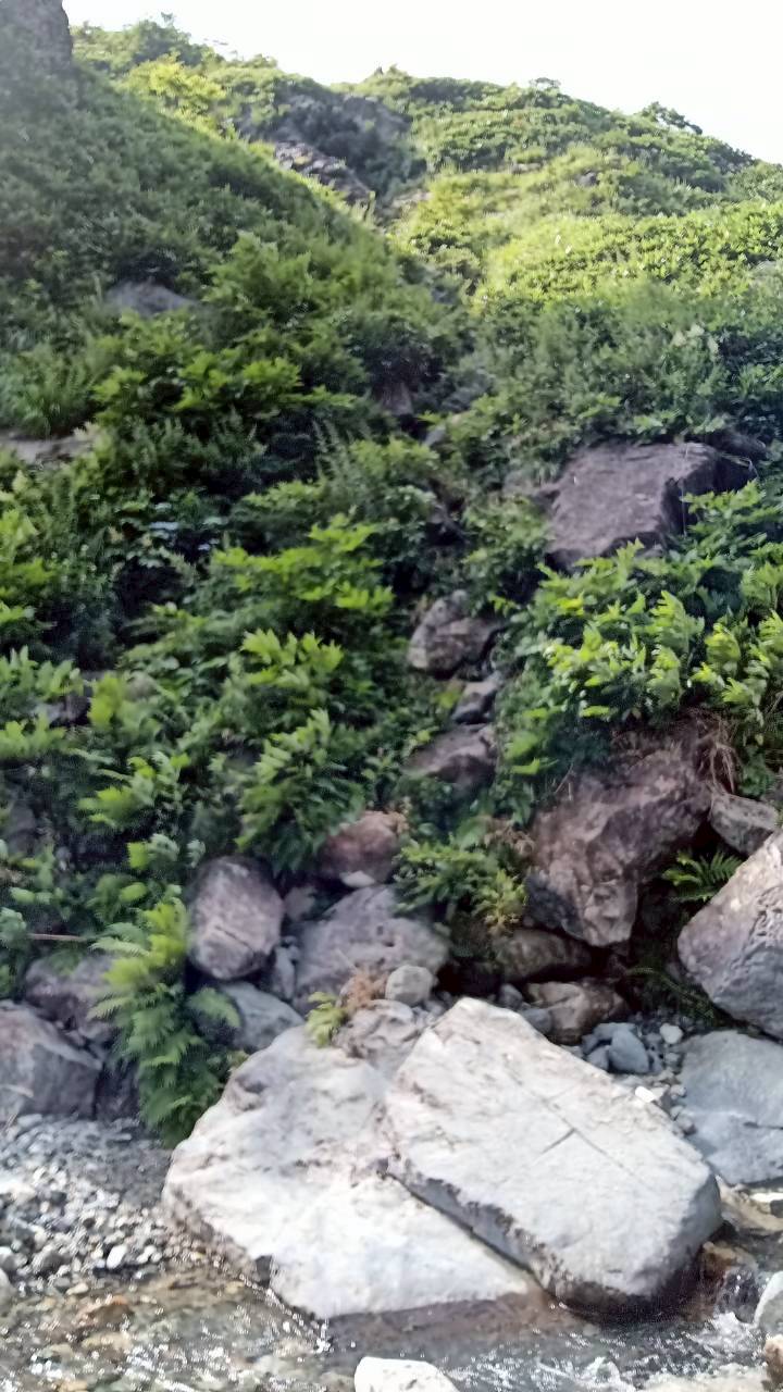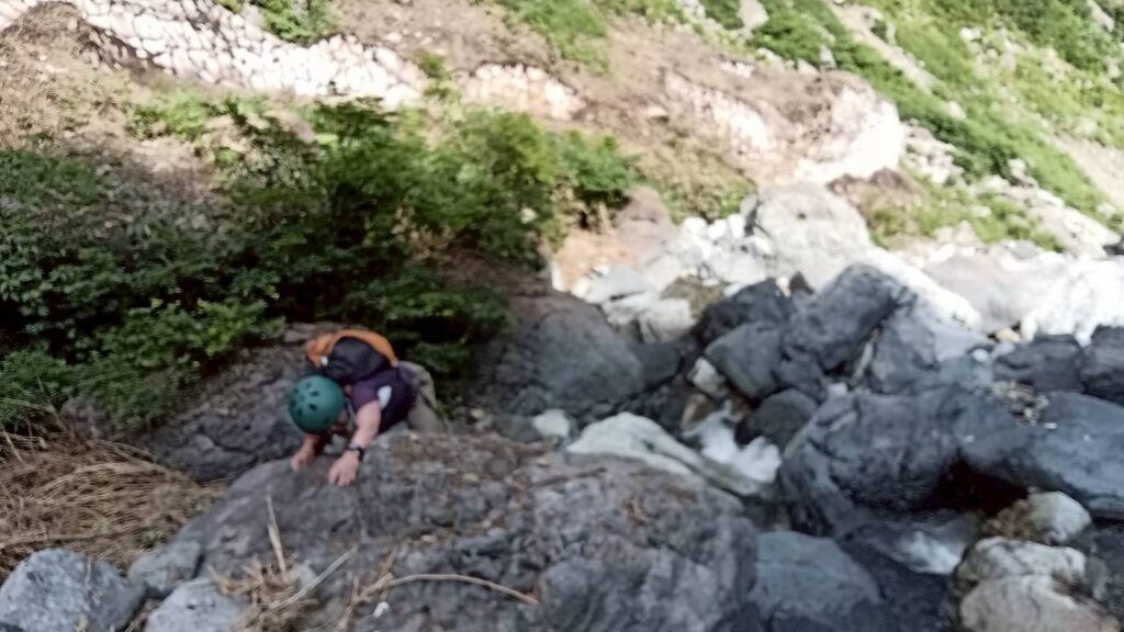 ここから沢登りのイメージ。ただ、水に浸かることはなかった。沢に転がる岩の一つ一つが大きかった。沢沿いに進めばいいのでルーファイというよりは登りやすい岩の部分を選んで歩くかんじ。