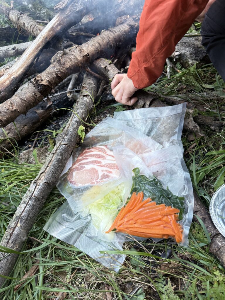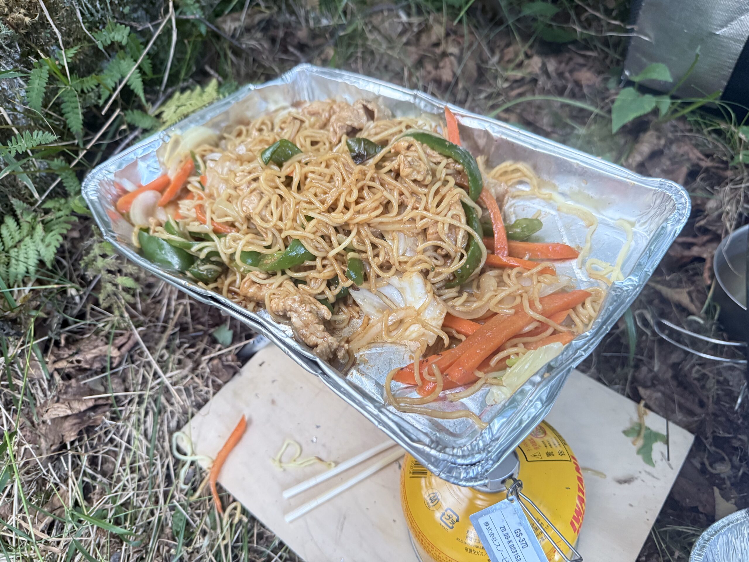 焼きそばセットも真空パッキングで保冷して持参! (火起こしやタープの写真はレイさん、コッシーさんのパート参照)