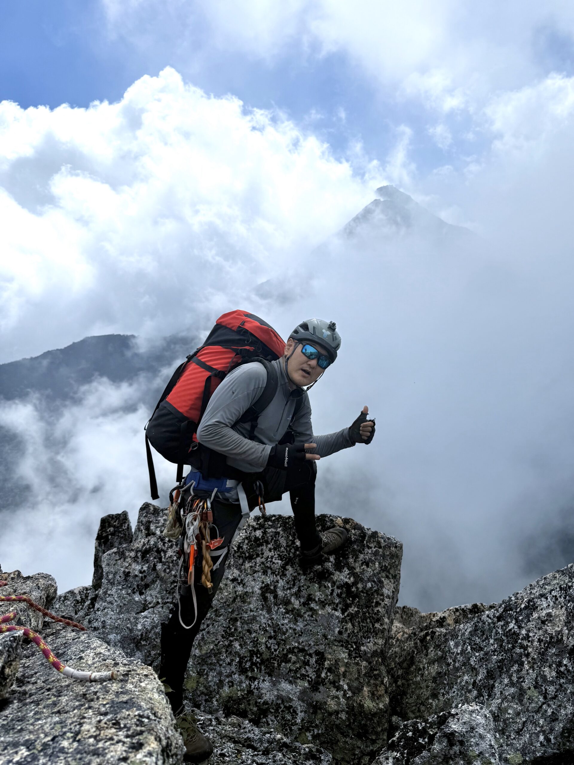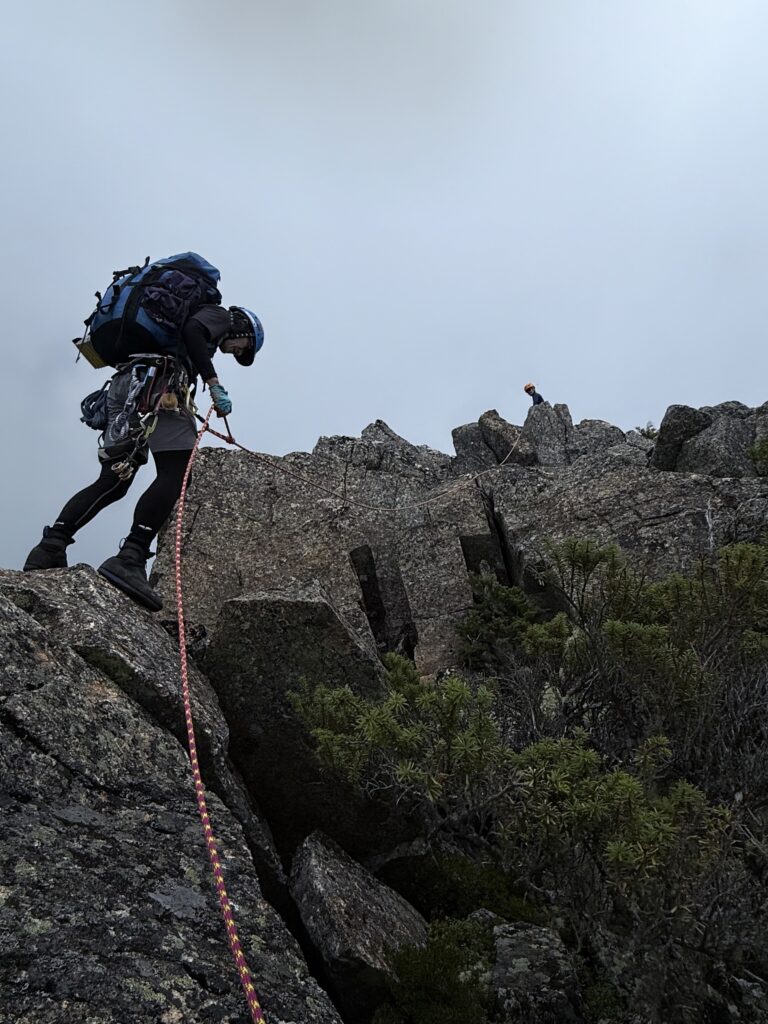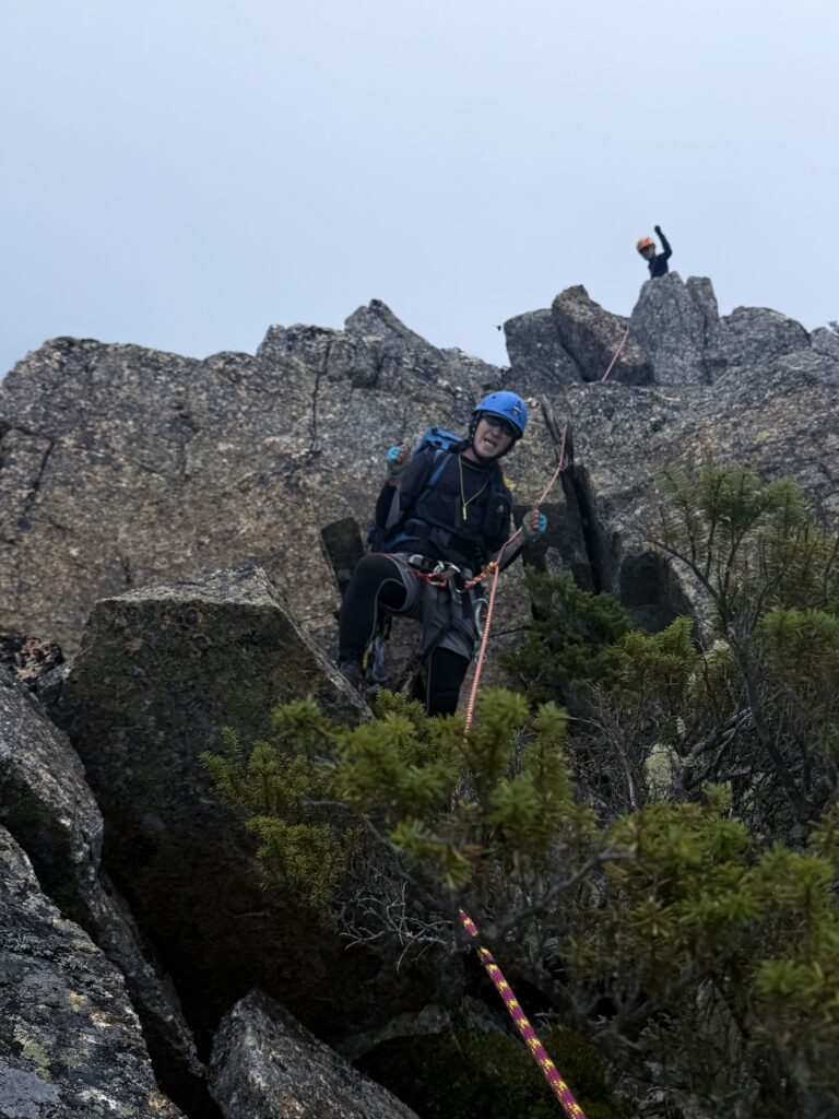 ブッシュを掴み攀じり、弱点を探しながらルーファイ、何とか4ピッチで山頂に到着!
