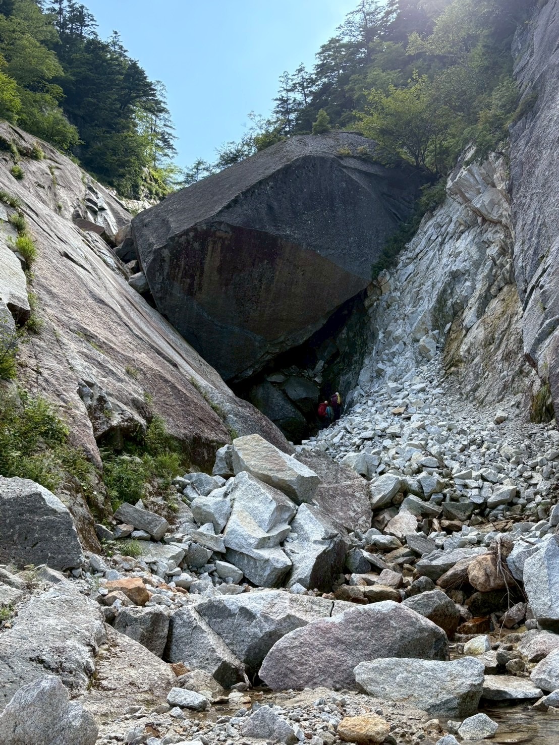 その後、巨岩帯へ突入し、一つひとつを越えていくのが大変。大きなものはダンプカーほどもあろうかという岩のサイズで、チョックストーンというには、あまりに巨大でした(^^