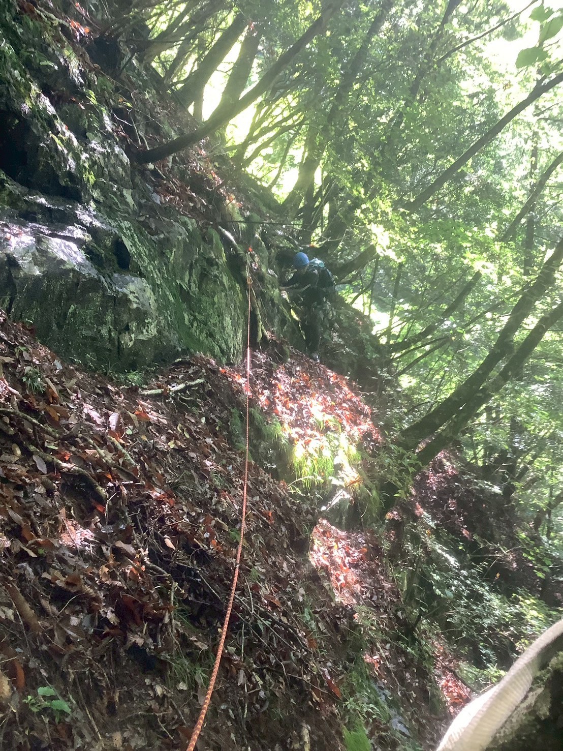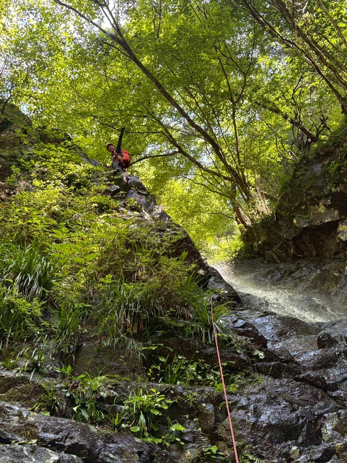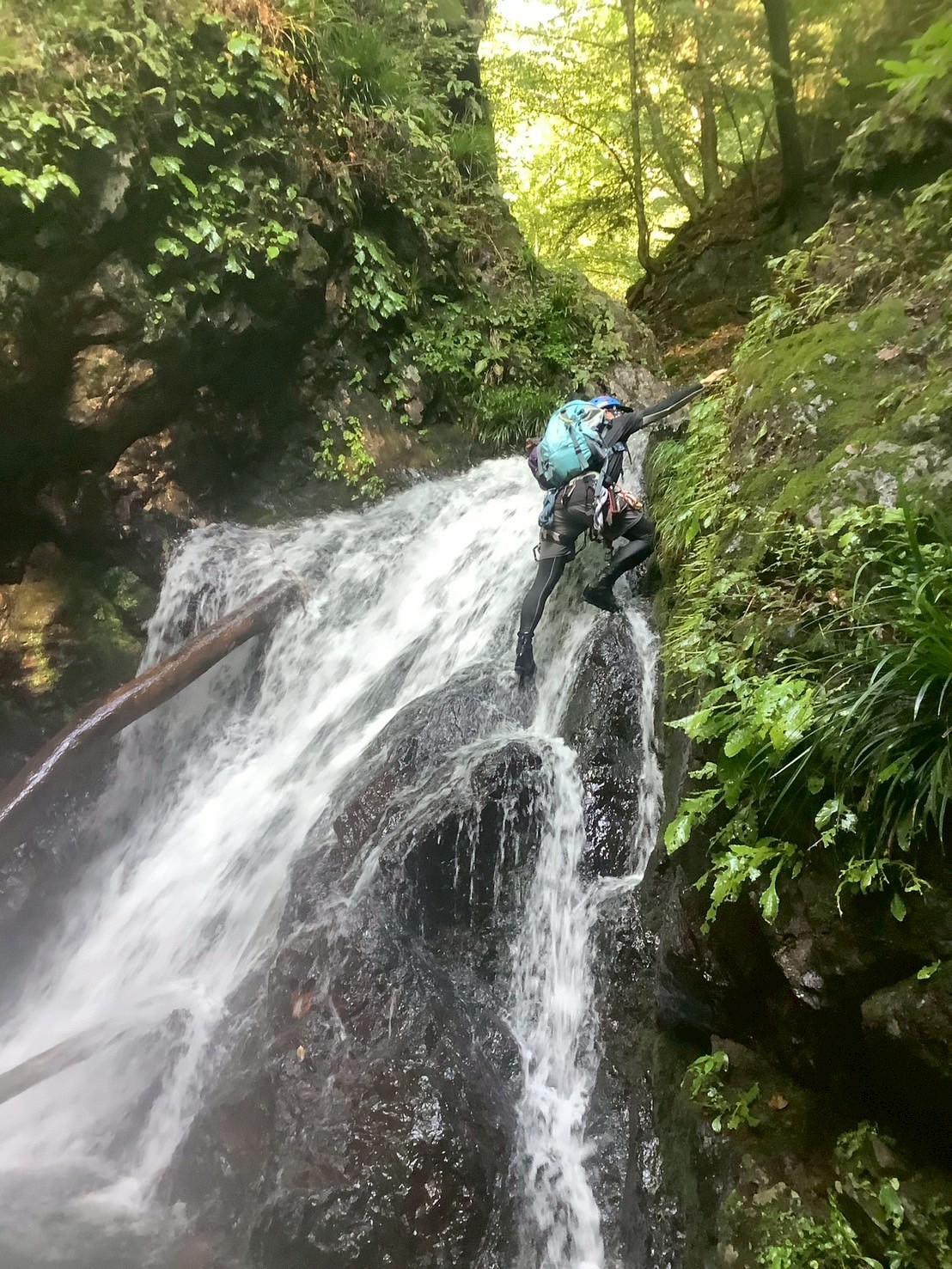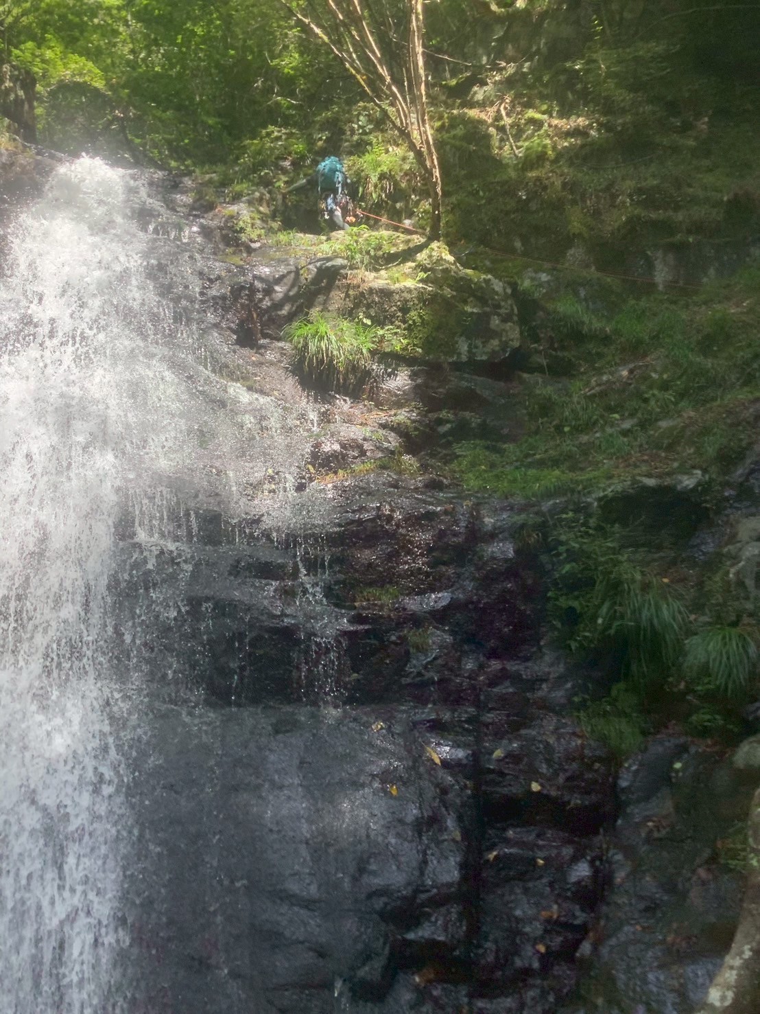 不動の滝(12m)は、右のルンゼ上からトラバース気味に巻いて行きますが、ここがかなり緊張でした😅