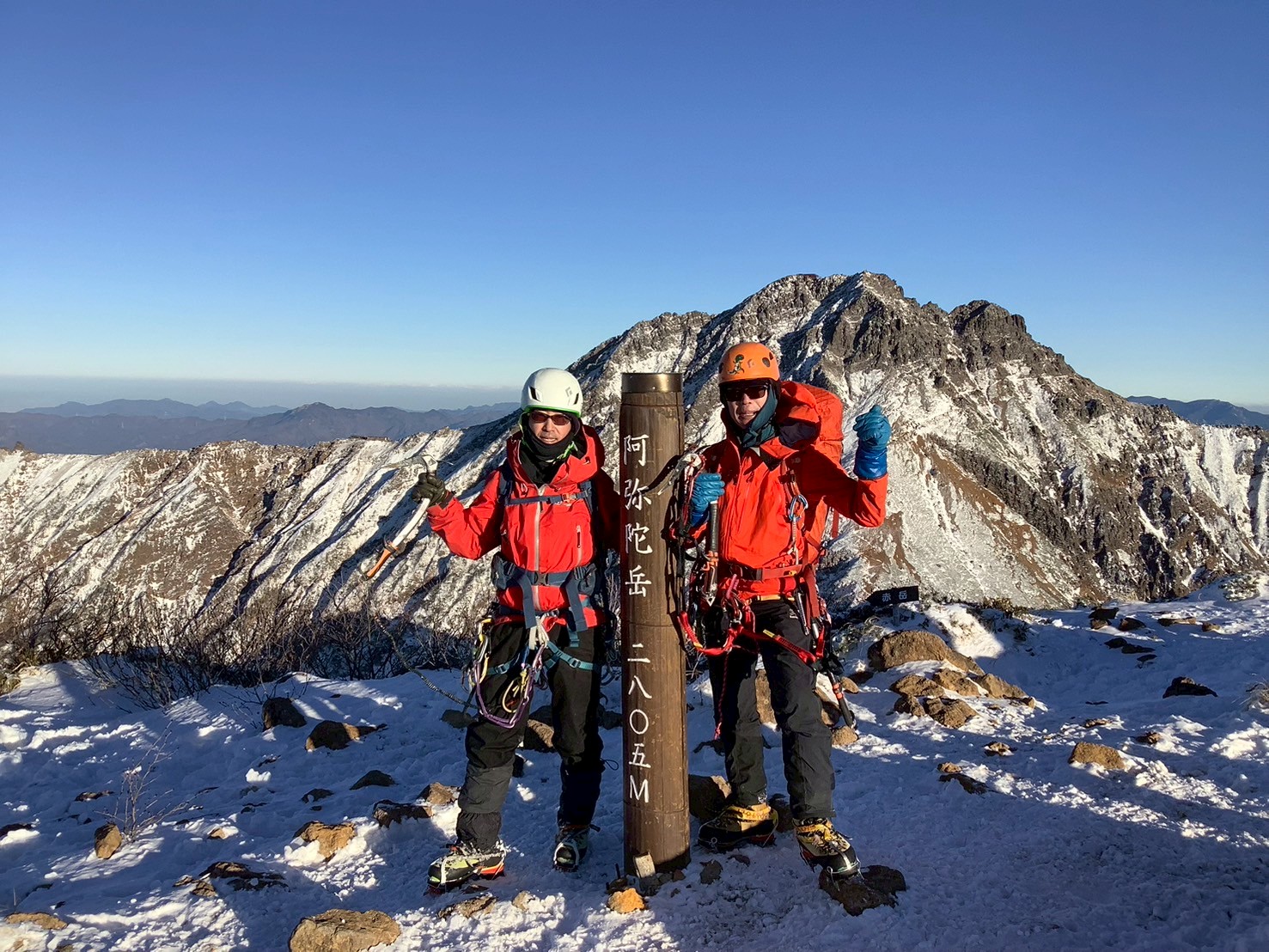 そこから阿弥陀岳山頂まではすぐでした。雪が付き始める前の赤岳と権現岳の景観をじっくり堪能できました。