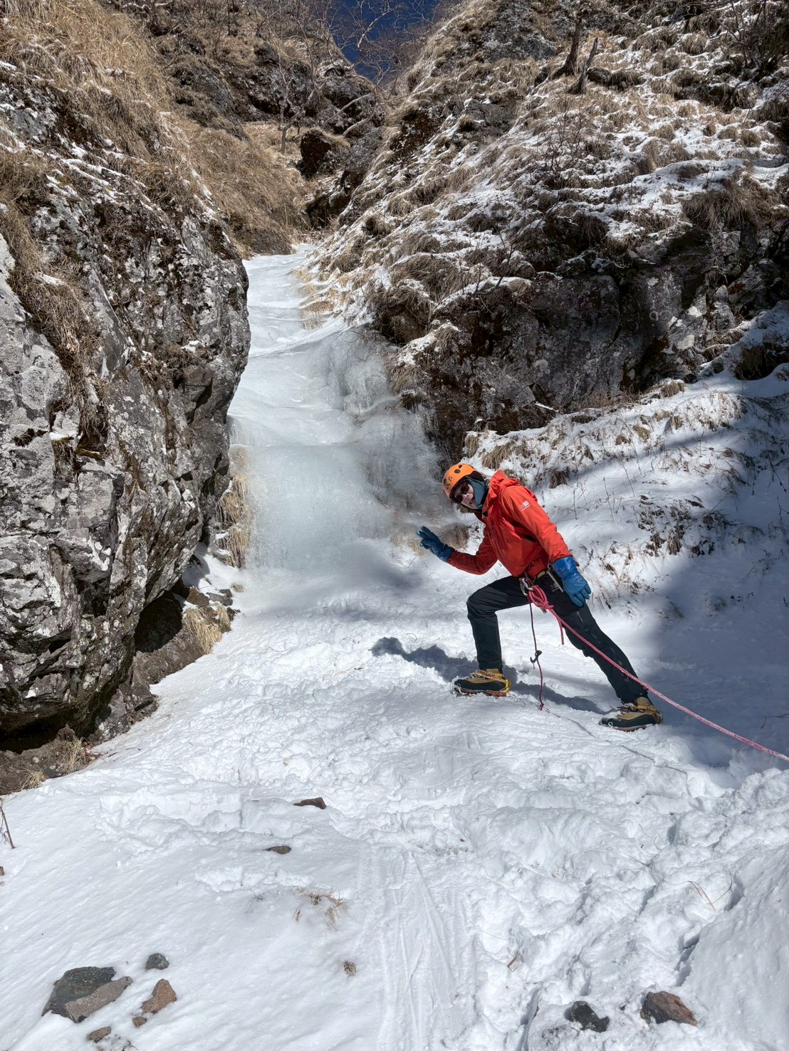 黄連谷の予行として申し分ないコンディション。滝の凍結が心配でしたが、寒波到来のおかげでしっかりと氷結していました。