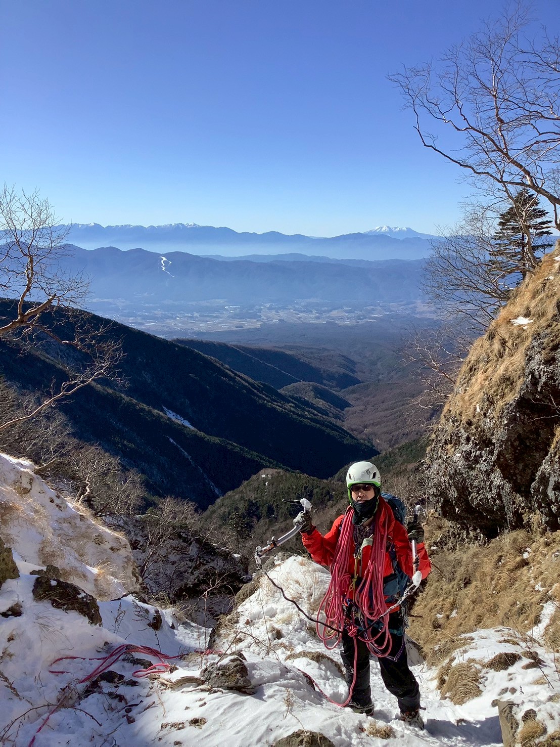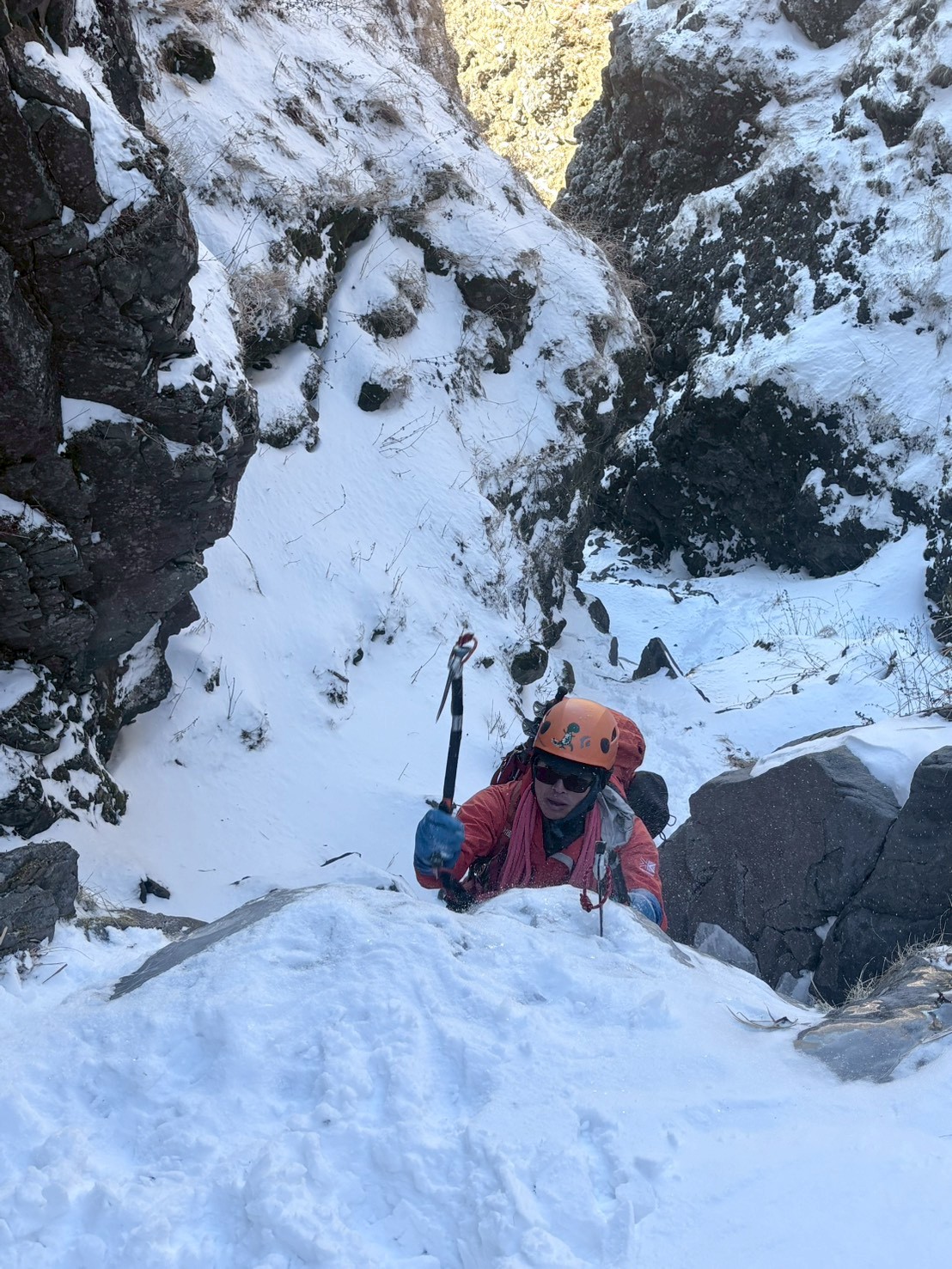 ここから先は氷と雪稜の快適なクライミングが続きますが、稜線までは思った以上に長い道のり。途中ペースが落ちてしまい、ロープをレイさんに持ってもらって助かりました。