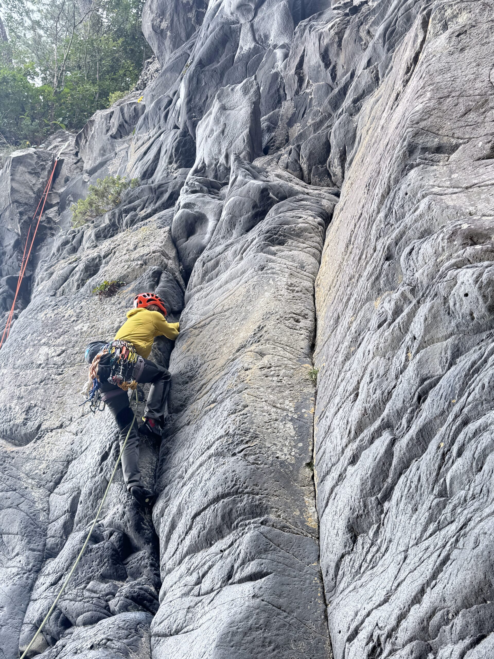 前回からの宿題である「ベビークラック5.8」。Trでカムをはさむ練習を何度か実施、リードはまた次回でいいかな〜と思っていたところ、「もうやっちゃえ」とHさんUさんに背中を押されていざリードに挑戦。カムを多めに持ち、確り決めながらどうにかトップアウト〜💪 記念すべき初カムリードとなりました。
