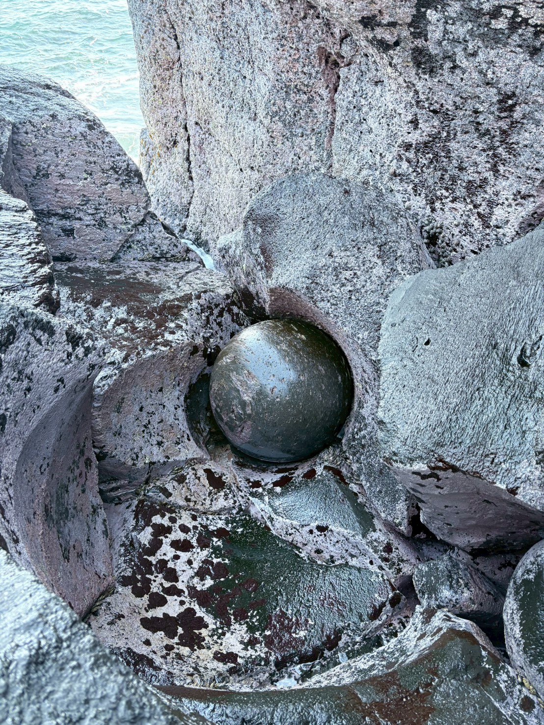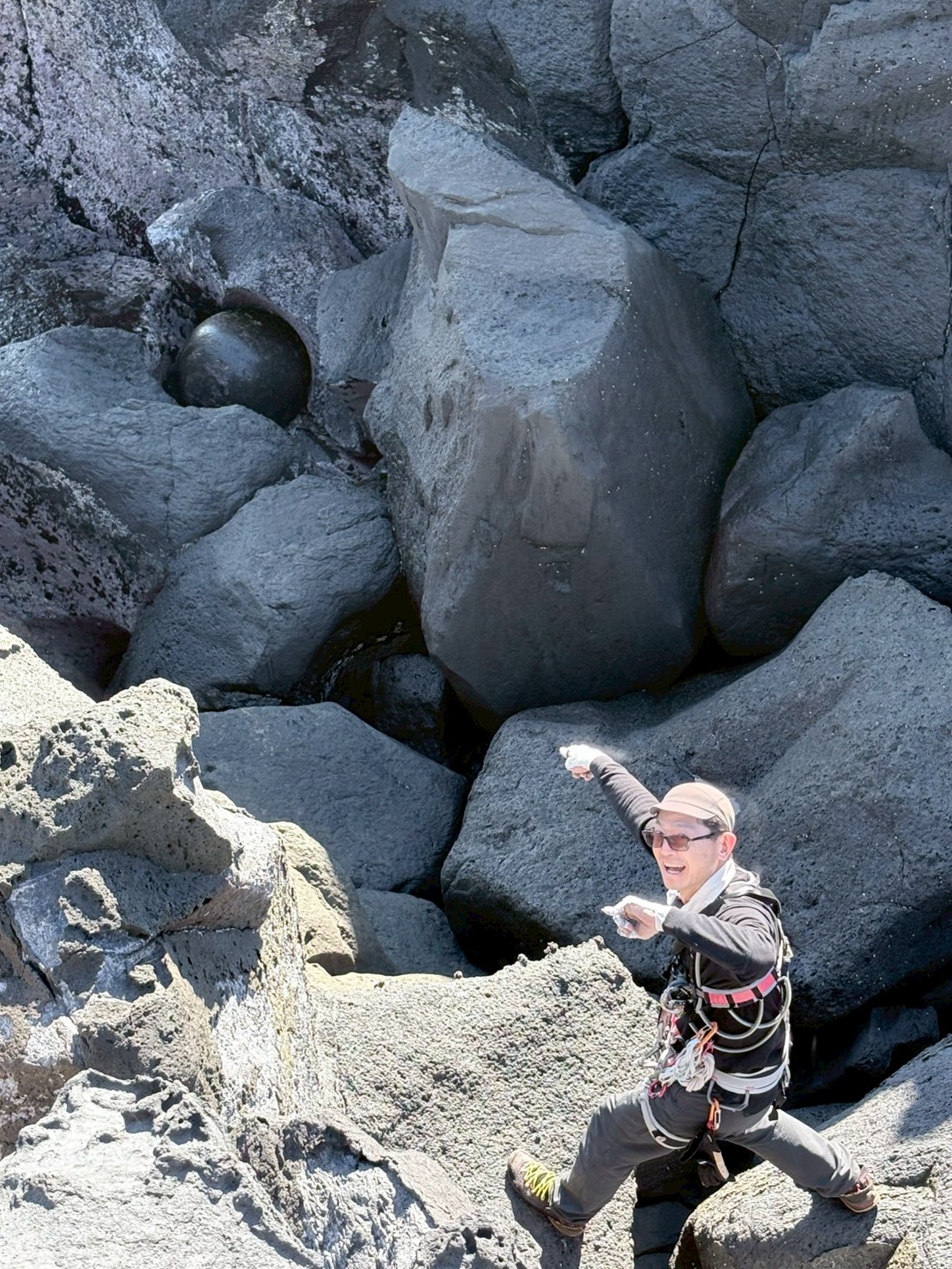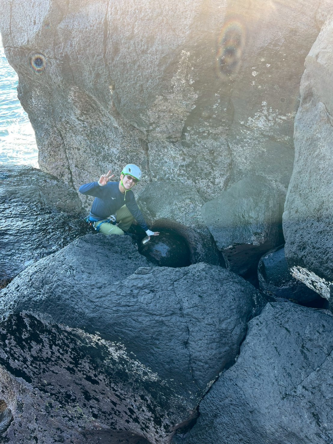 シーサイドは人気のためか待ち時間が発生していたため場所を移動し、前夜話題になった「かんのん浜ポットホール」を見に行き、その周辺でクライミングをするという素敵な計画を立てて頂きました。以前から見てみたかった場所なので、観光気分でLet‘s go!