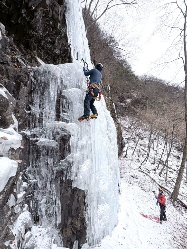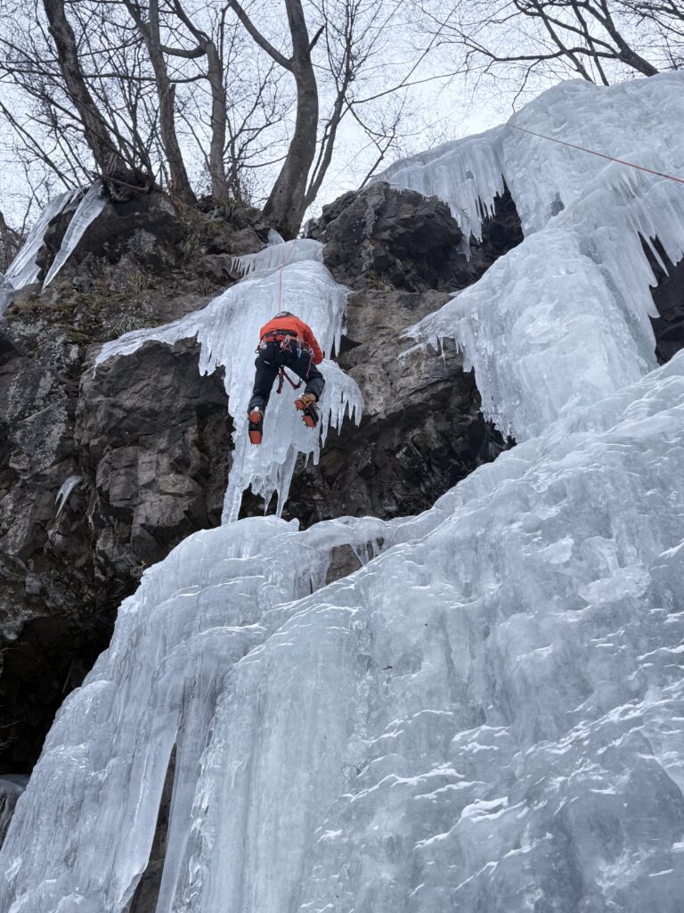 1本目は、右から取り付く。見た目よりアイスが立っていて、しかも氷はカチカチ。アックスがなかなか決まらず、緊張の連続でした。