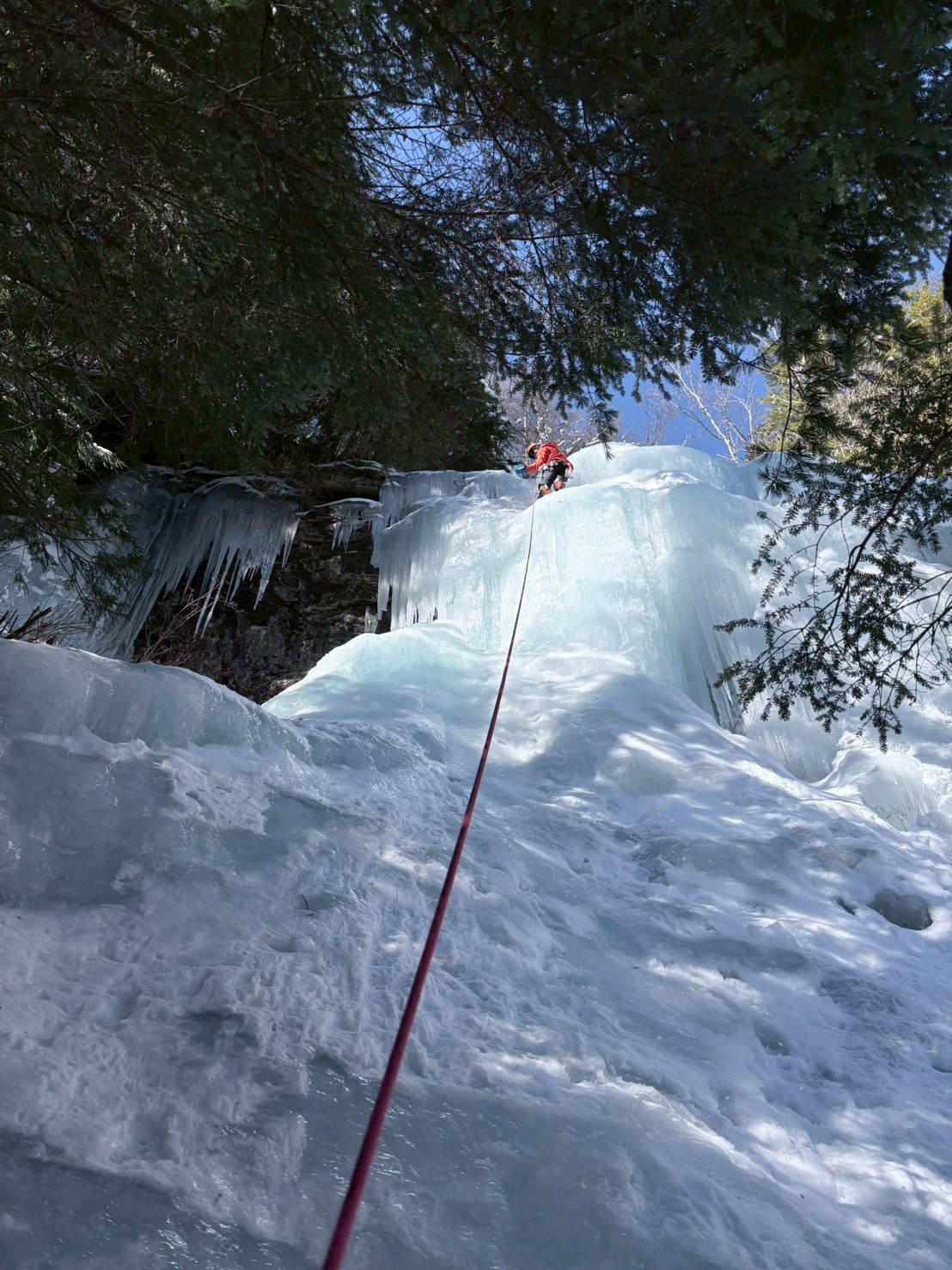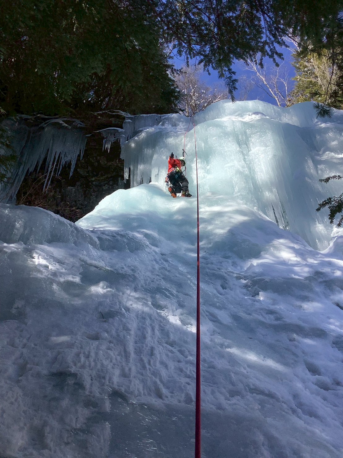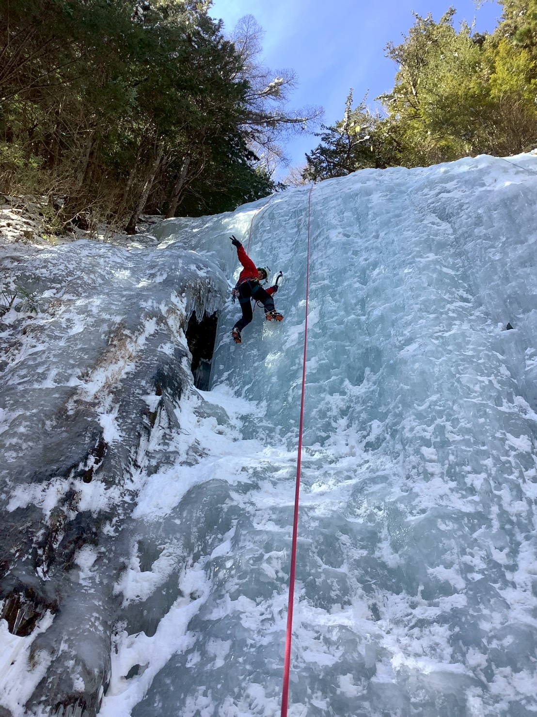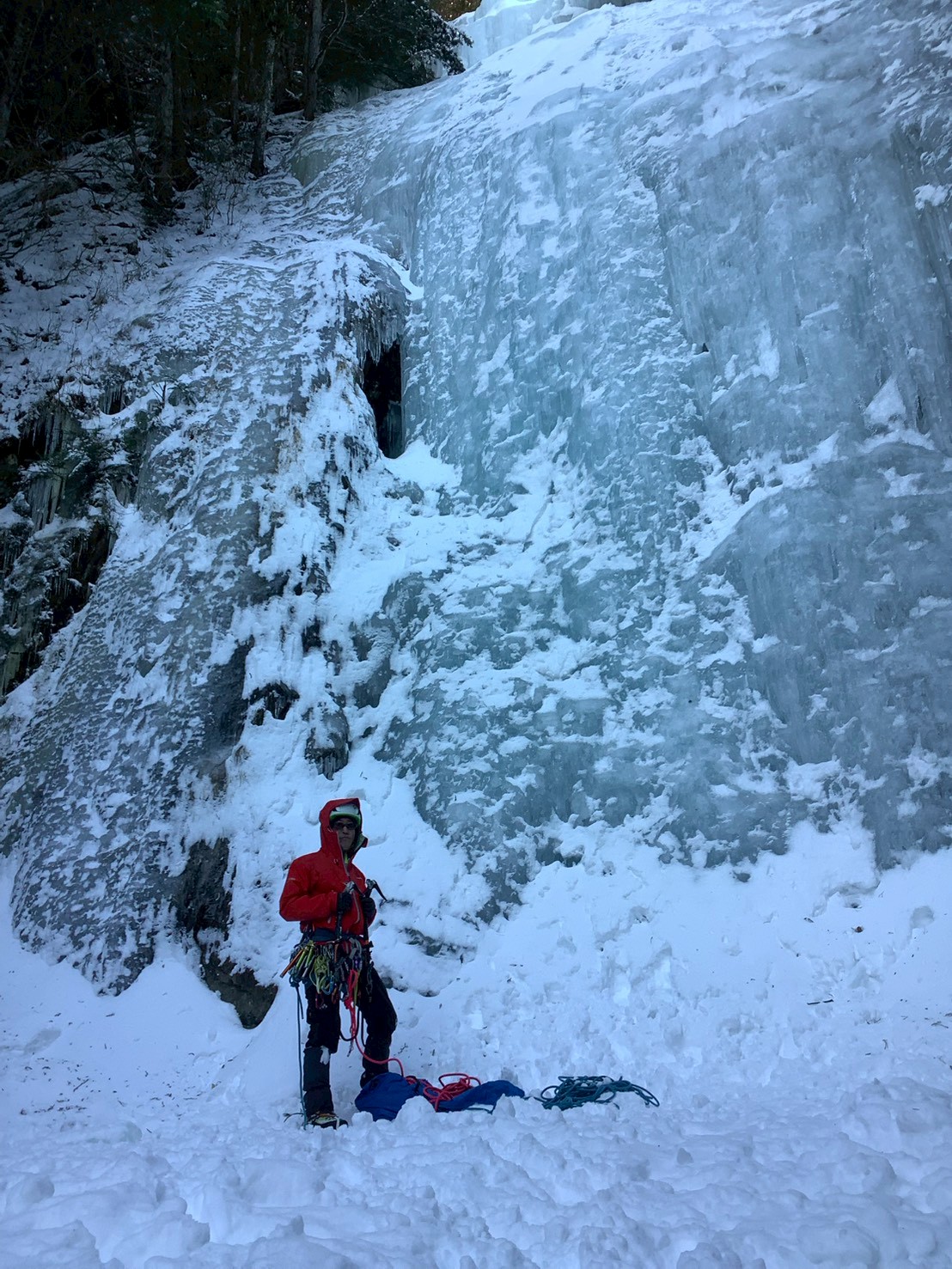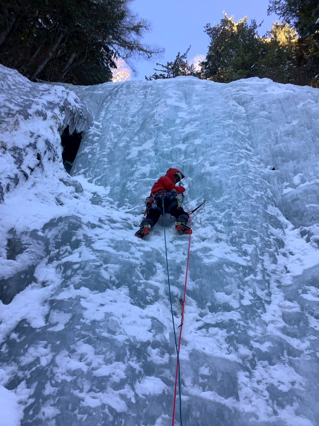 1P目、約25mくらいをリードして、スクリューで支点構築。スクリューは8本全て使用しました。途中、アックスを打ってフィフィに体重かけると、水が噴出してきて、びっくり。内部まで完全凍結してなかったみたい。