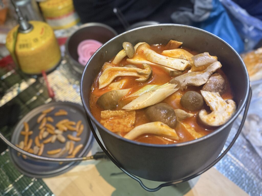 この夜、テントでコッシーが調理してくれたキノコたっぷりキムチチゲが絶品だった〜♪