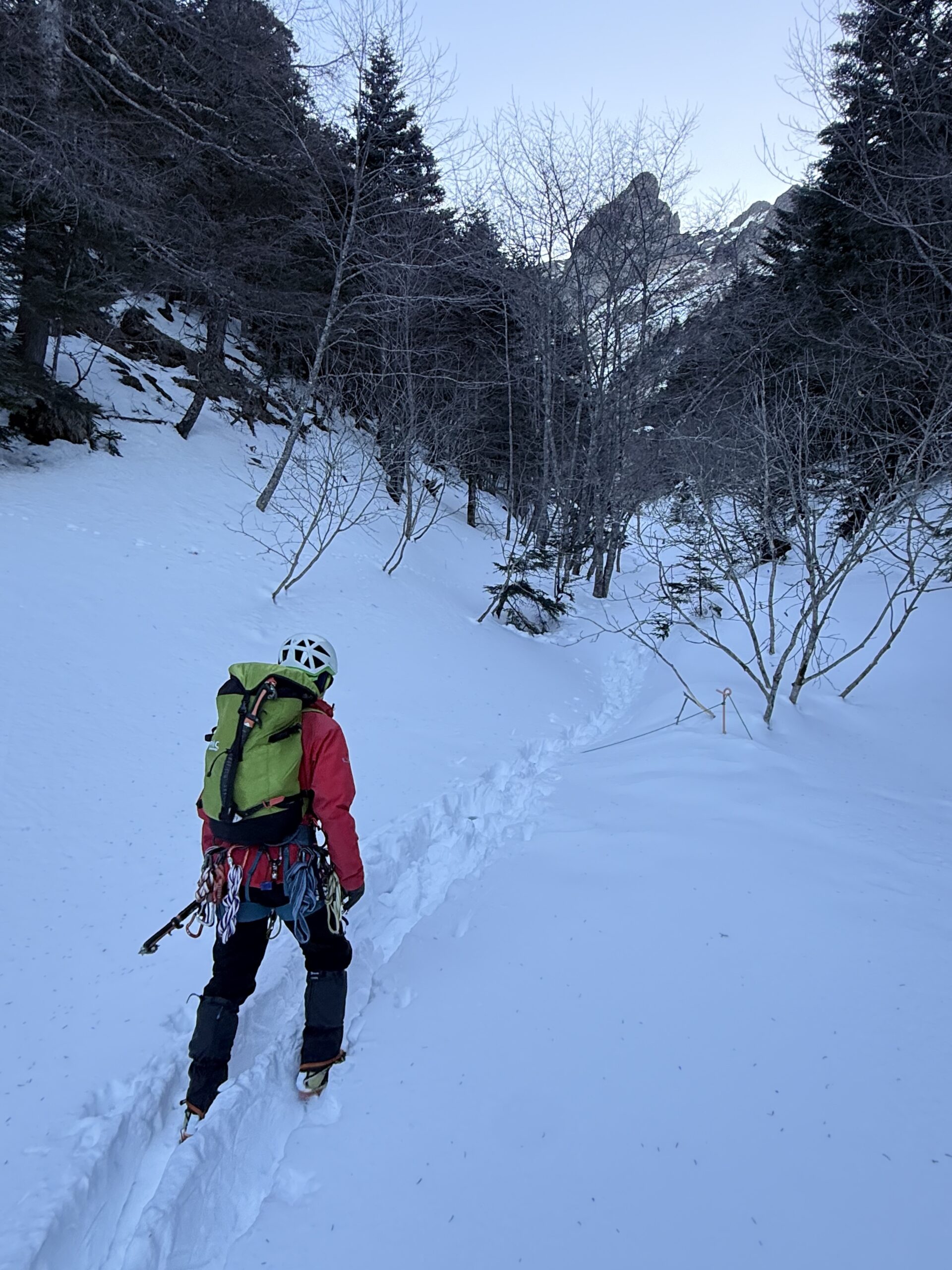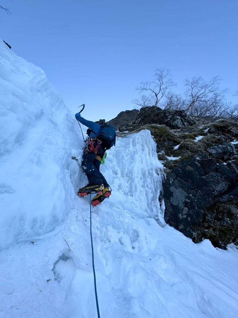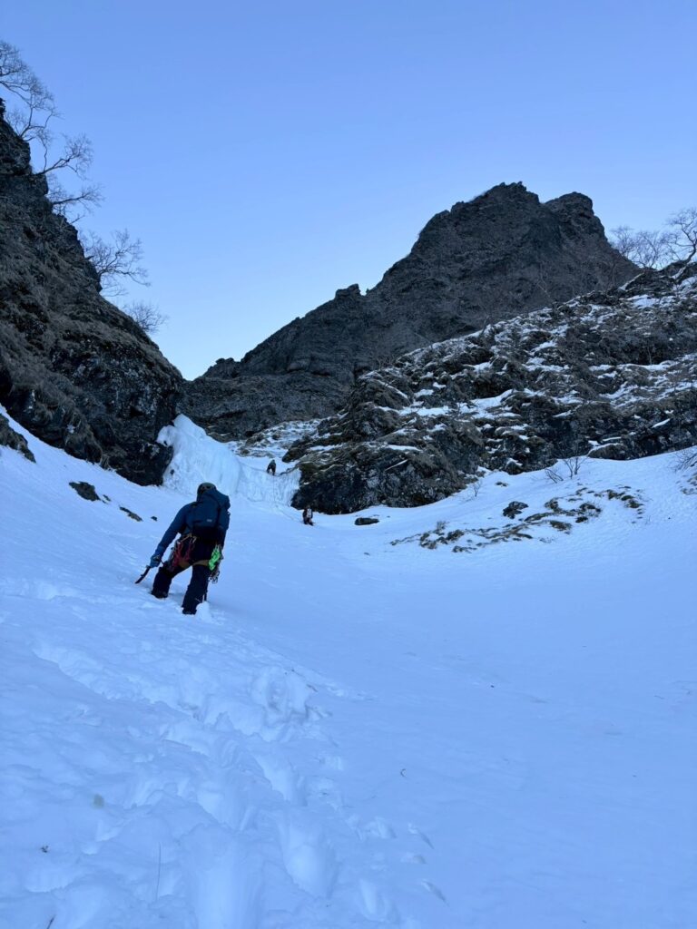 F1-F3は、滝が埋まって上部が少し出ているだけだったのでフリーで越え、F4はガジさんリードで越える。アイスの要素は少ないものの沢を詰め上げるのは楽しい。