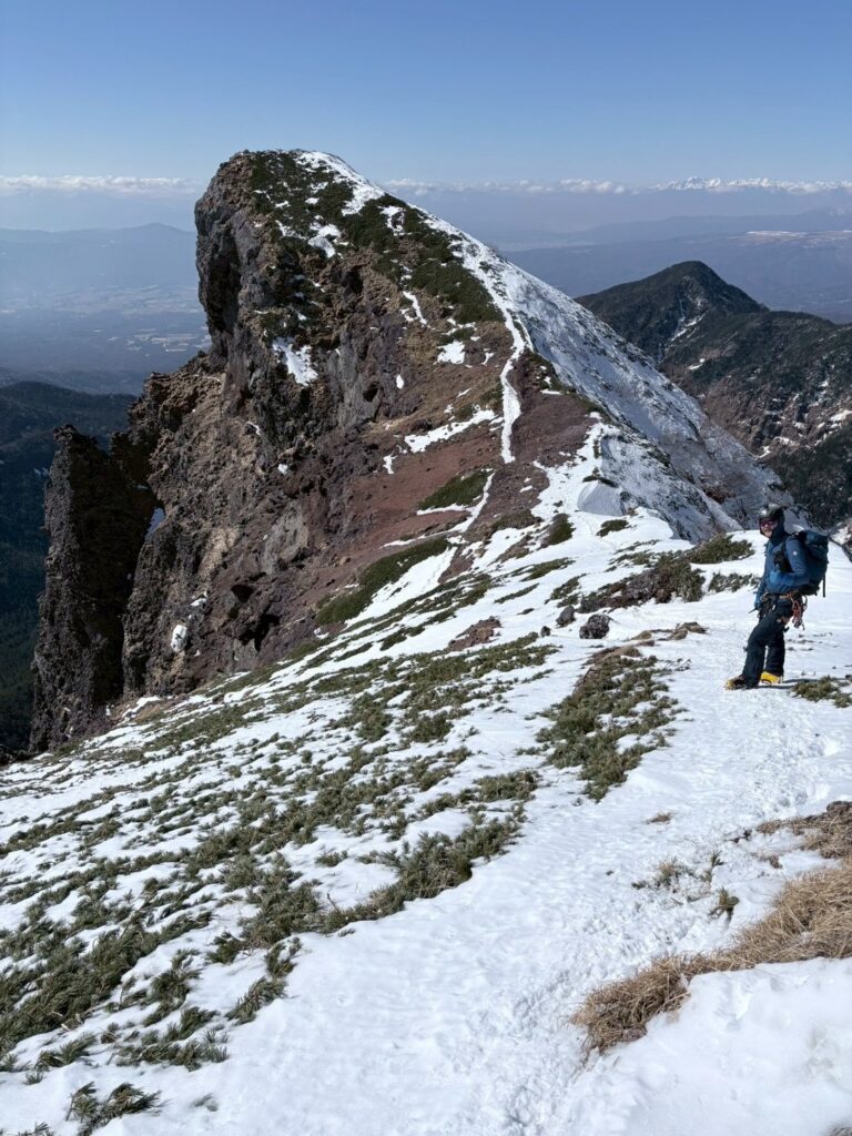 そこからトラバースし、1月に引き返したポイントを通過。小同心を目の前にすると、ほぼ雪がついていない。しかも太陽が当たって暖かく風もないし、コンディションは最高!